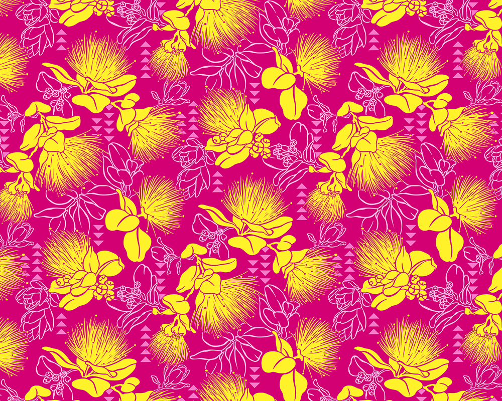 All over design featuring lehua flower, leaves and tapa.