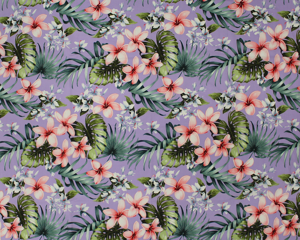 All over design featuring plumeria, white ginger flower, monstera and palm leaves.